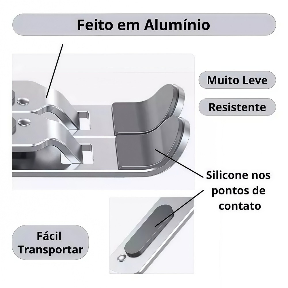 Estabilidade e Segurança: Seu design inteligente conta com silicone nos pontos de apoio, garantindo que seu notebook permaneça estável em qualquer superfície, evitando deslizes e possíveis acidentes.